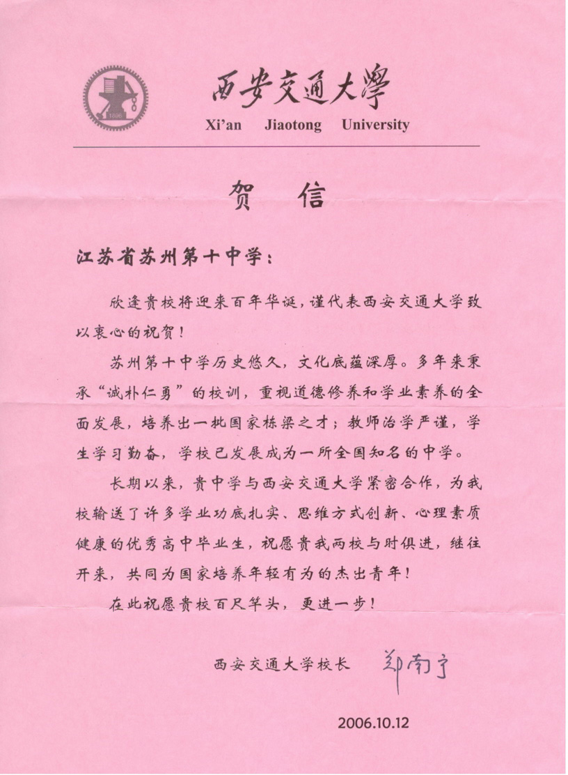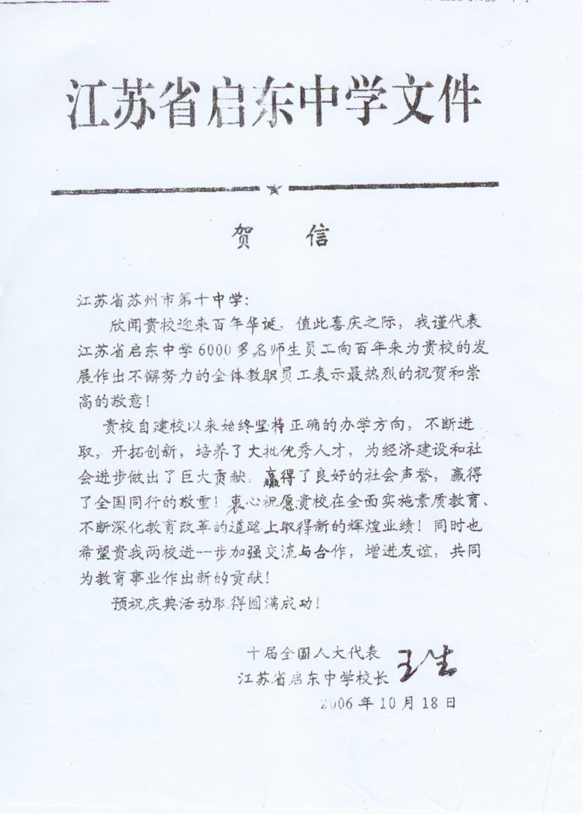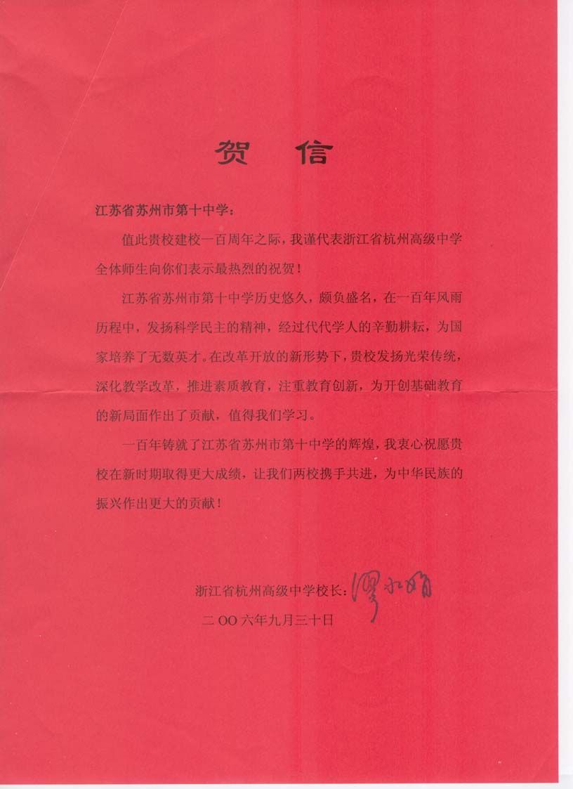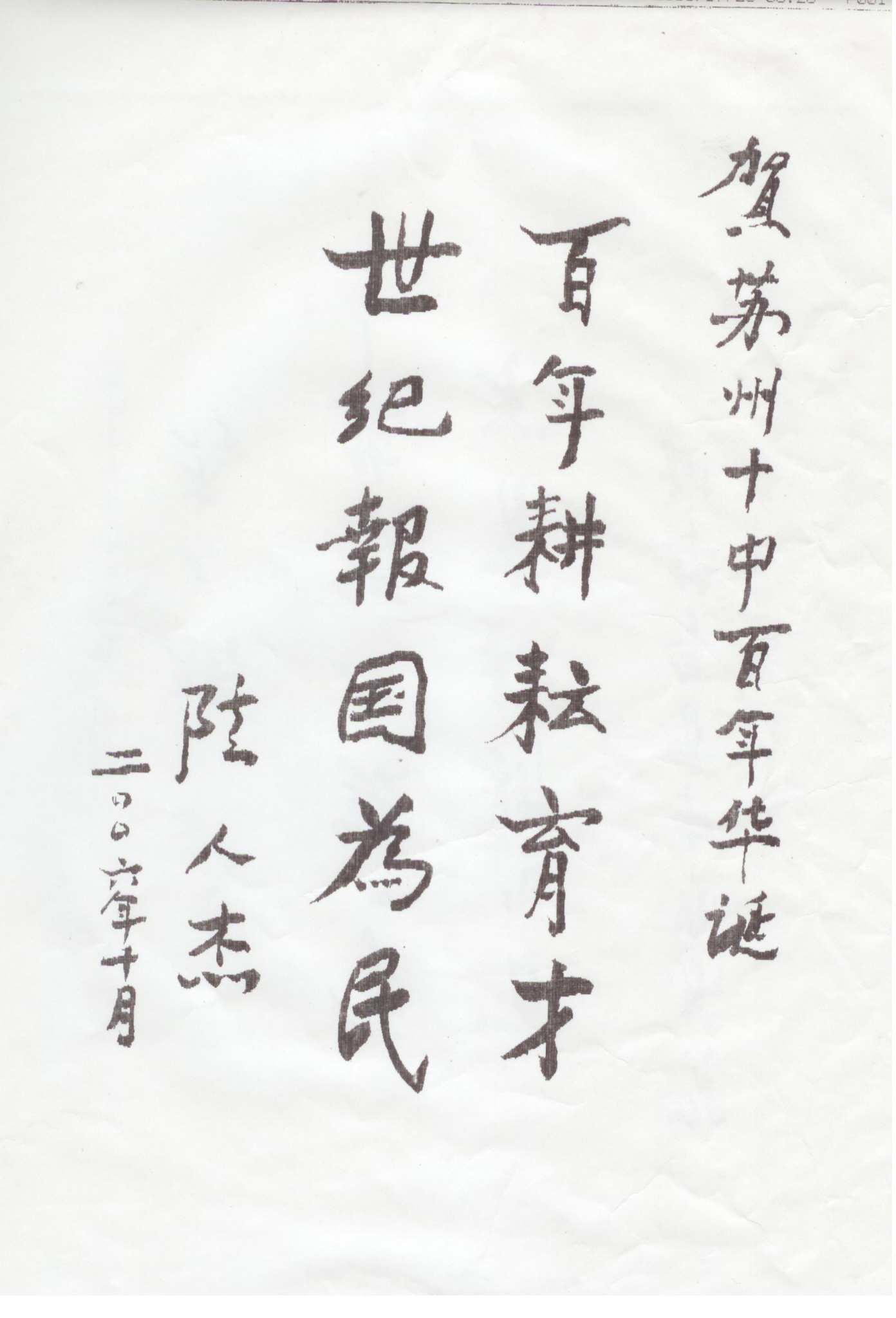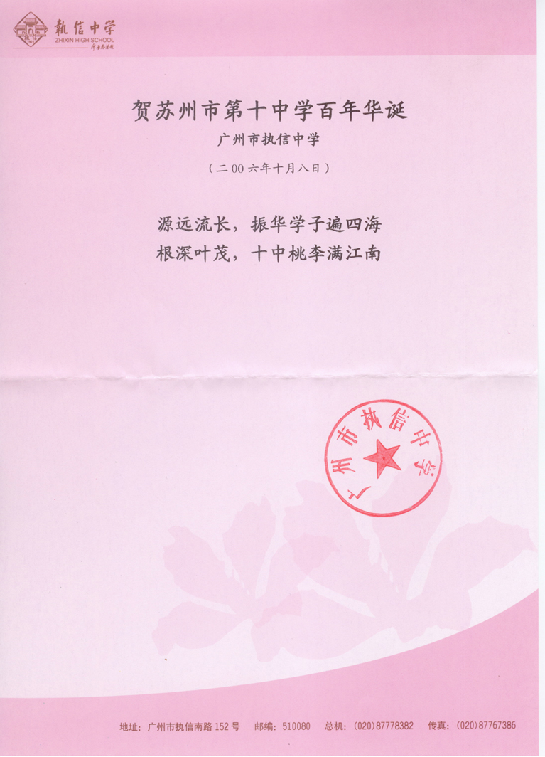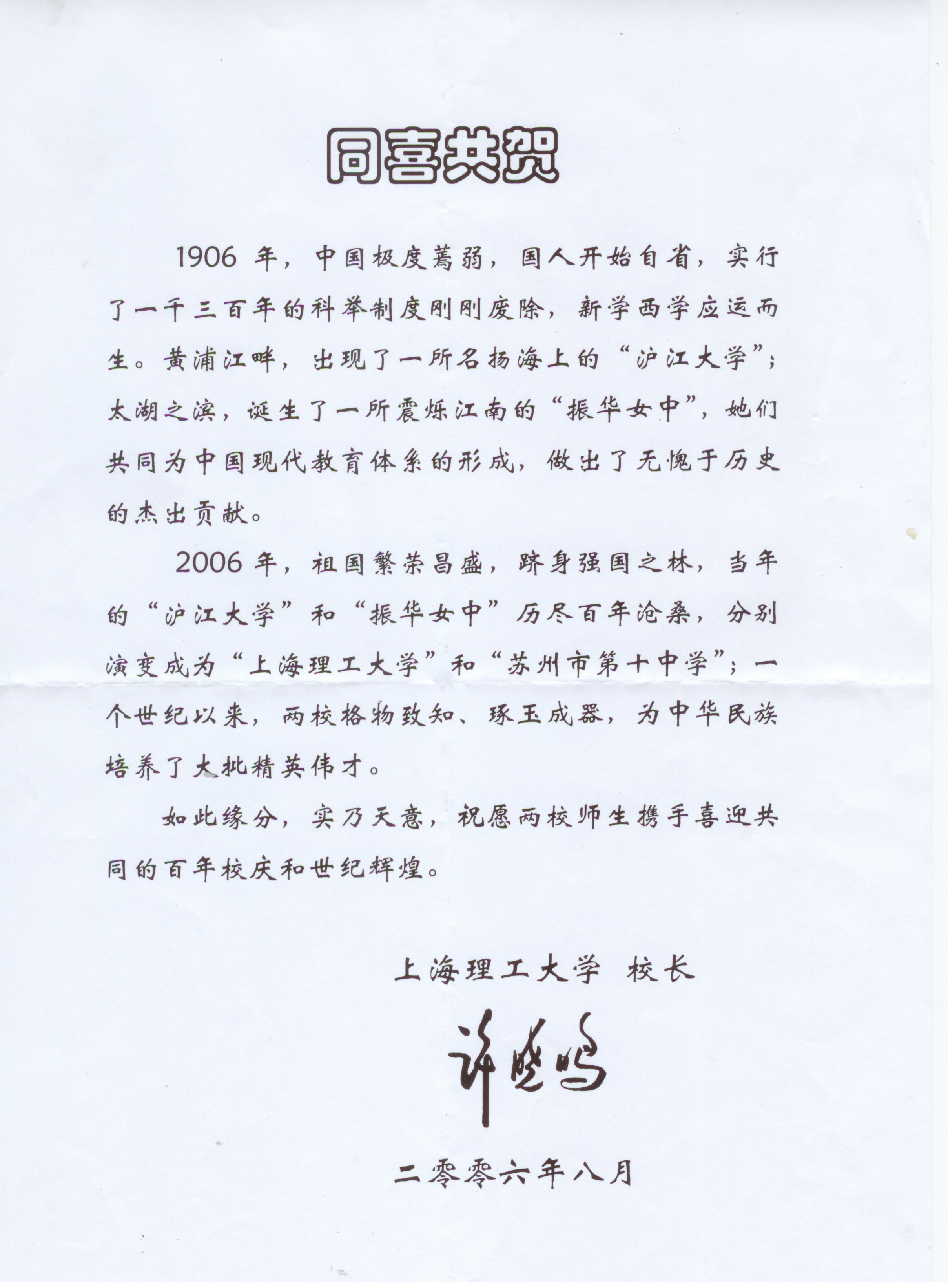 苏州寒山寺主持秋爽为学校百年校庆题词