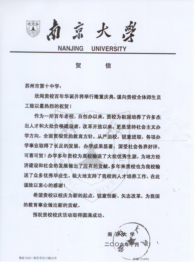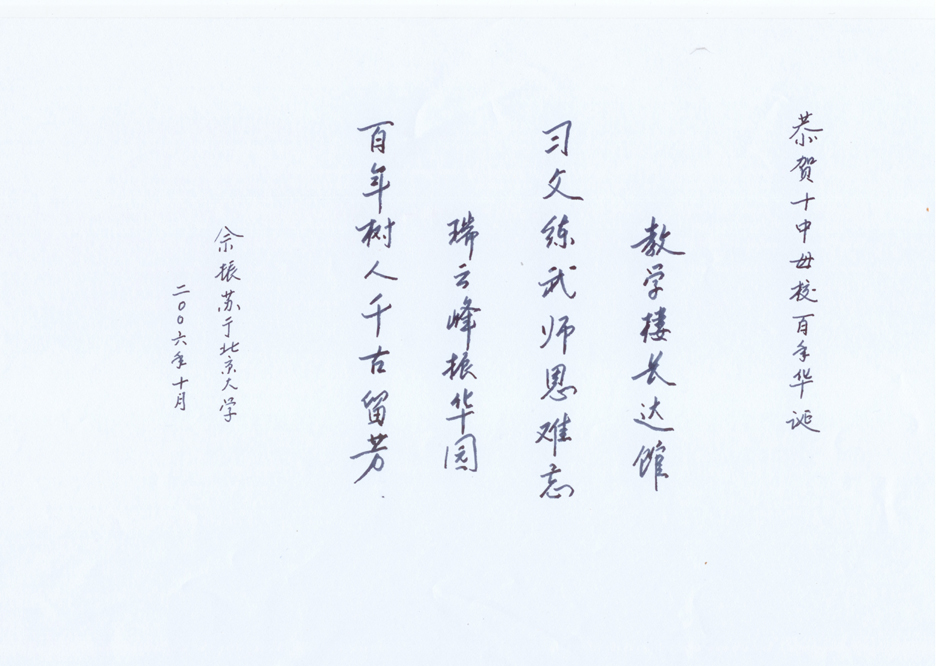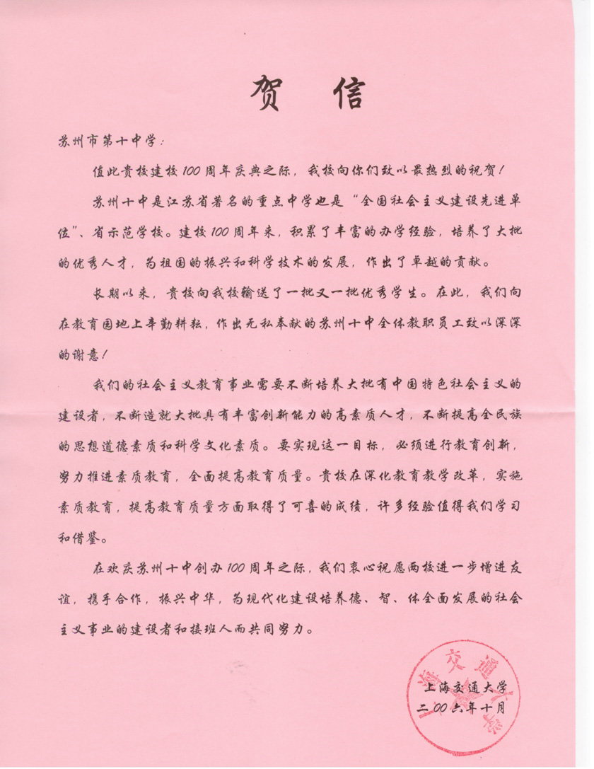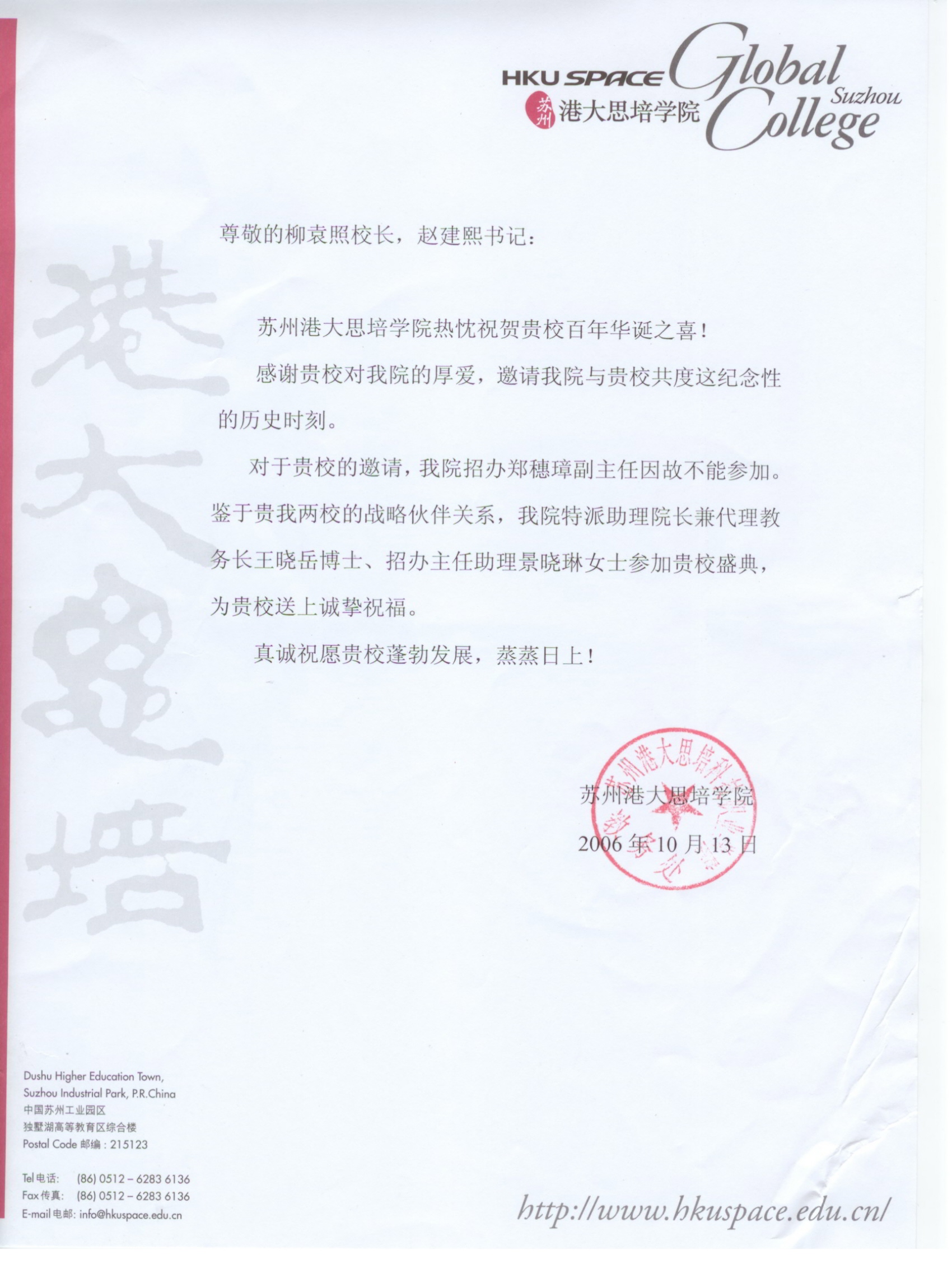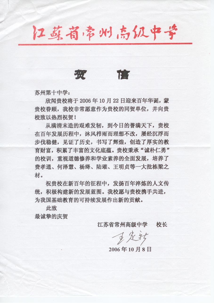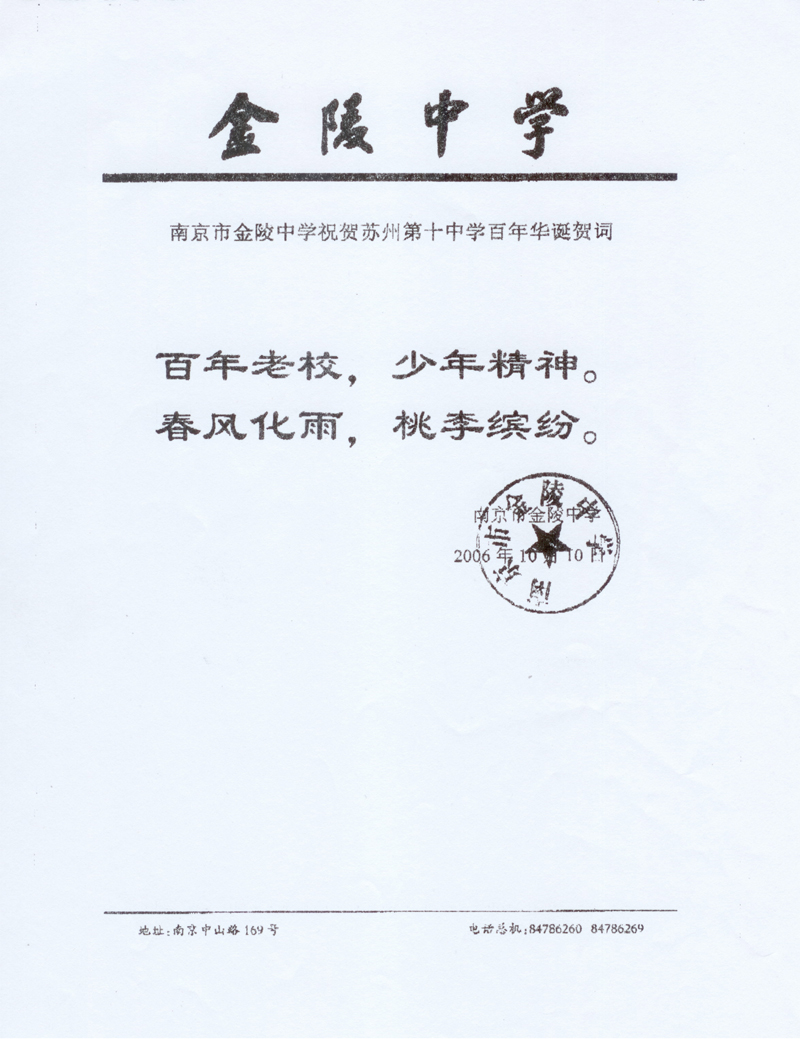 苏州寒山寺主持秋爽为学校百年校庆题词