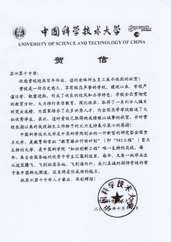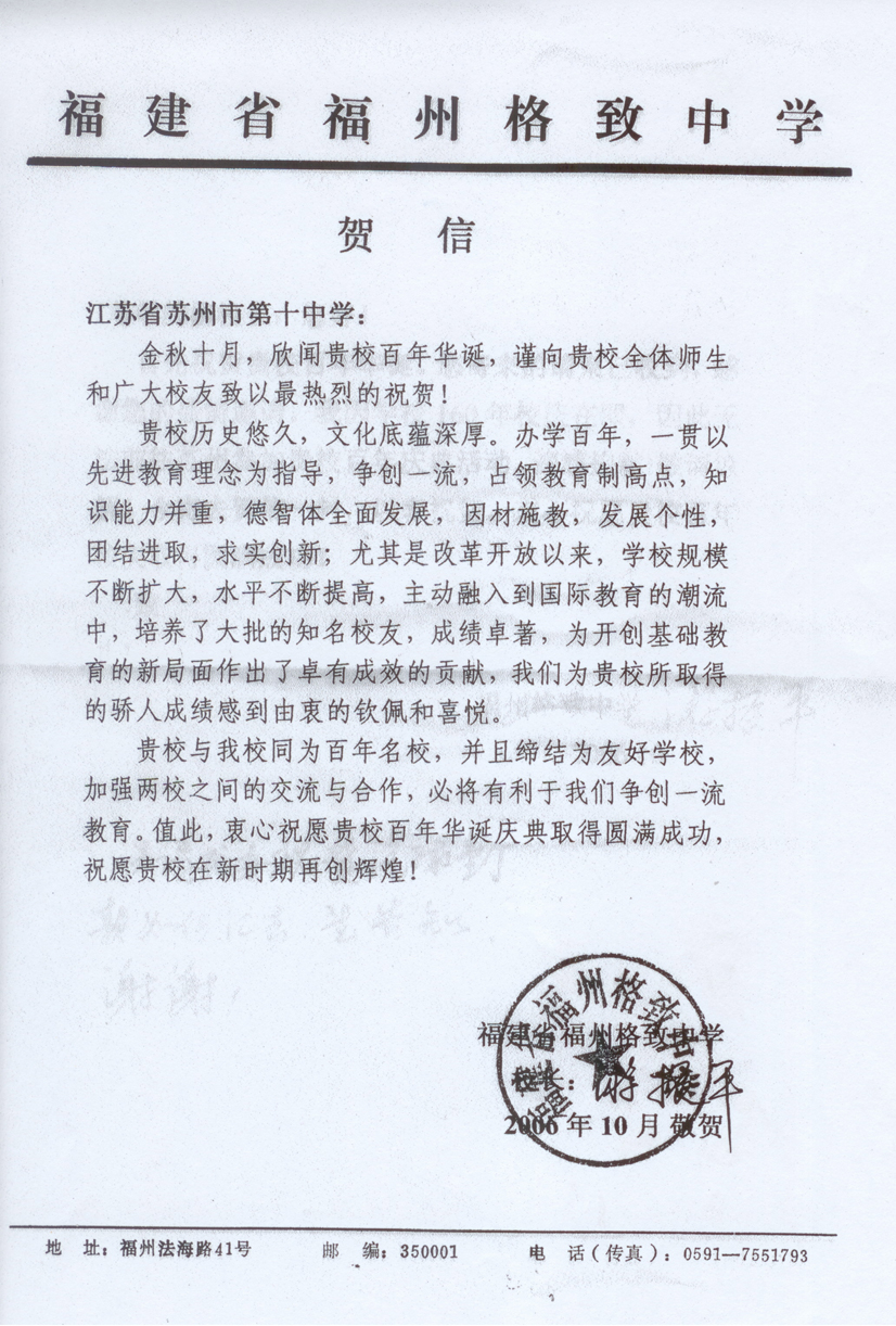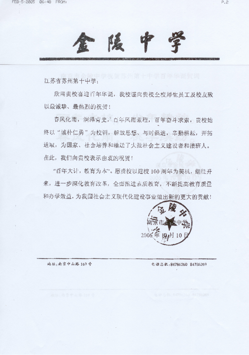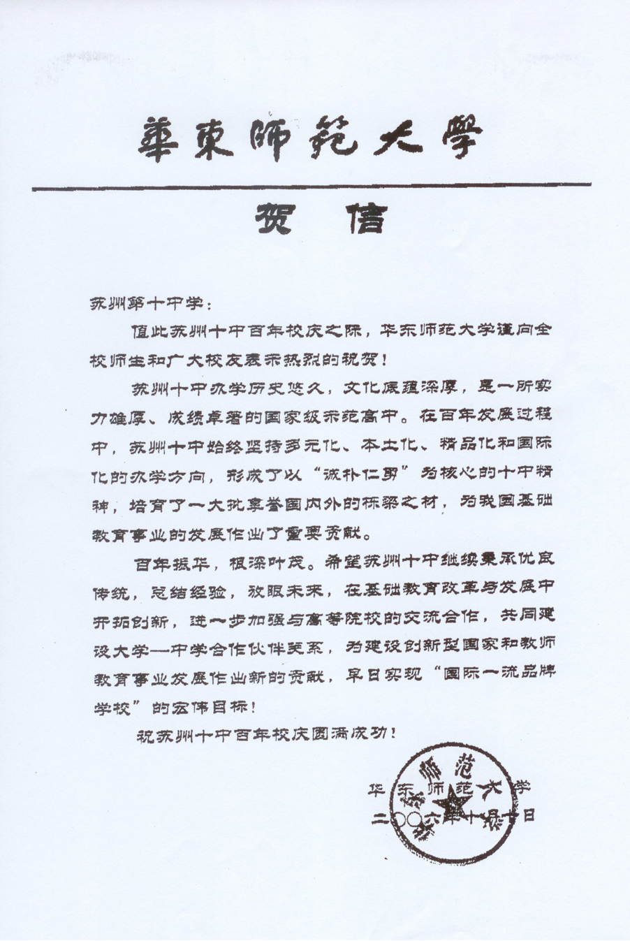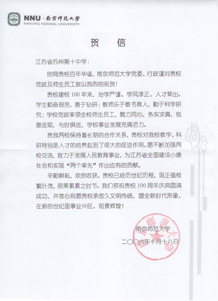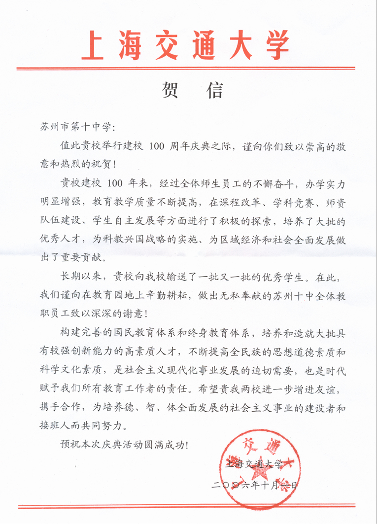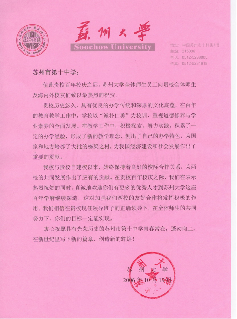 苏州寒山寺主持秋爽为学校百年校庆题词