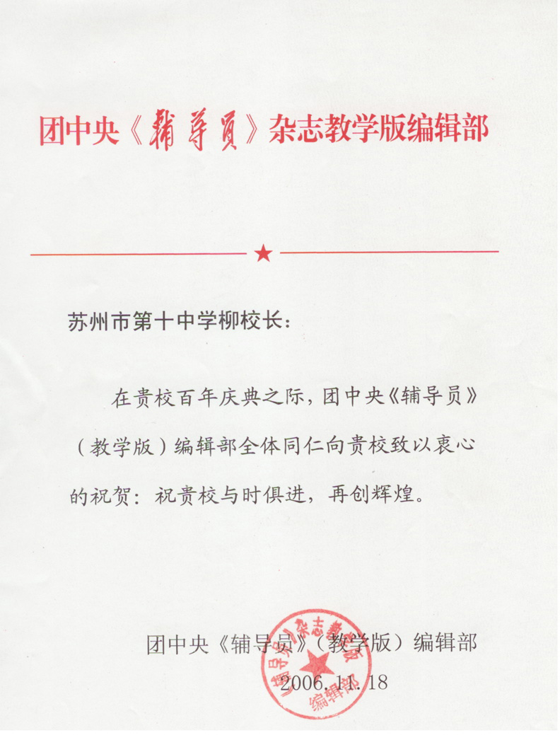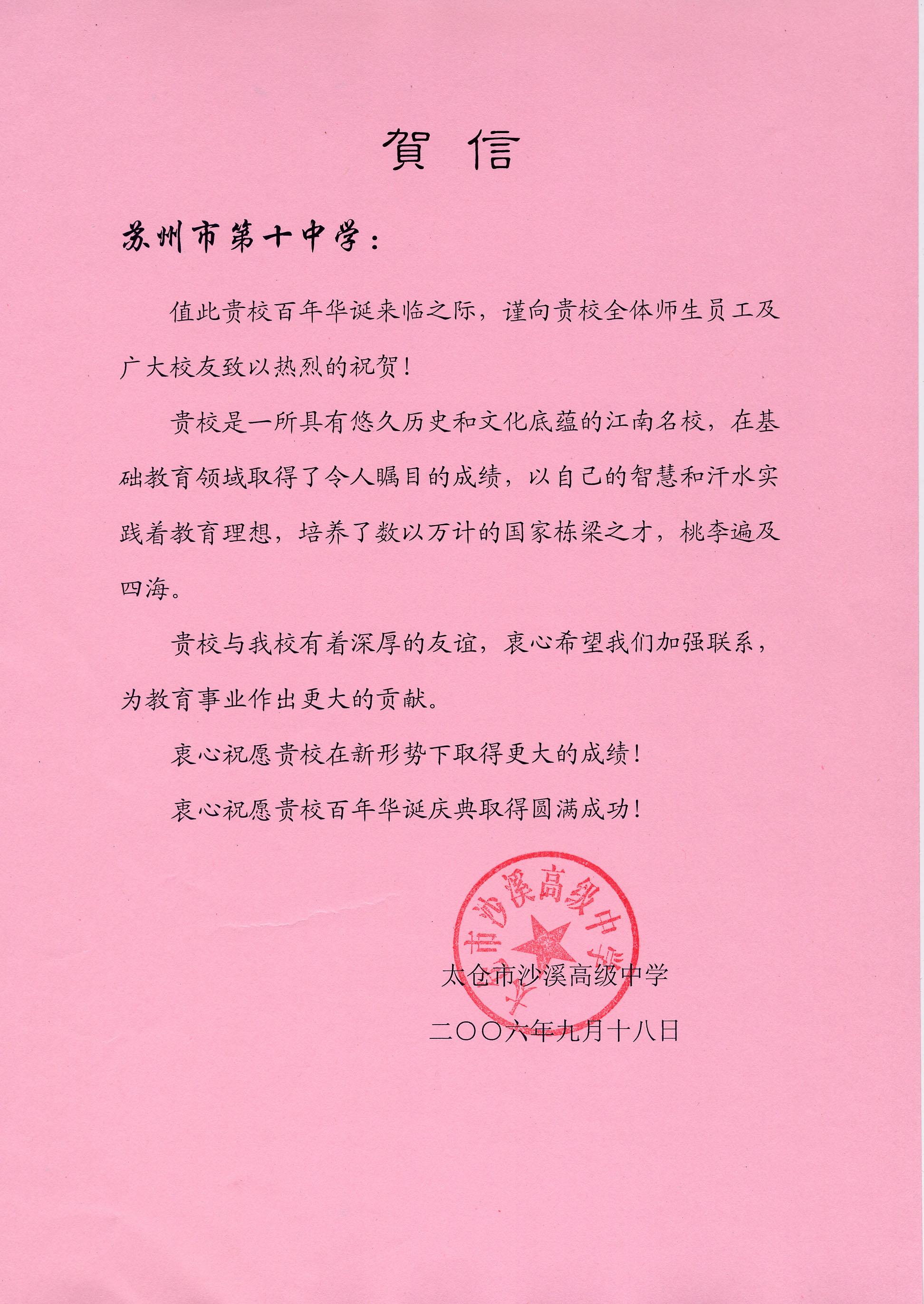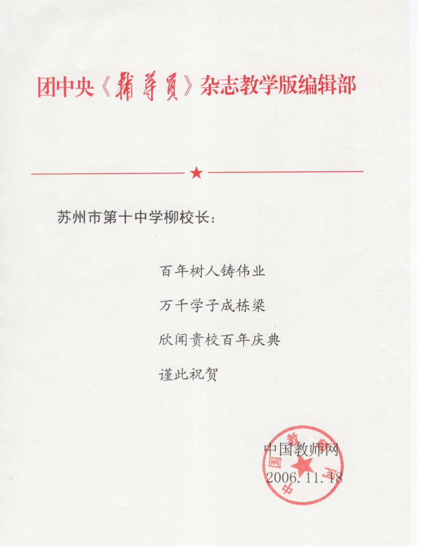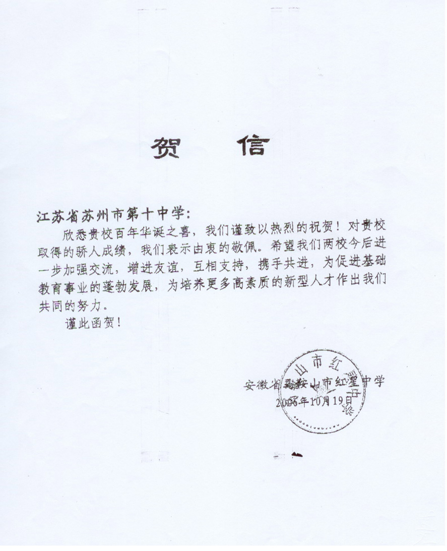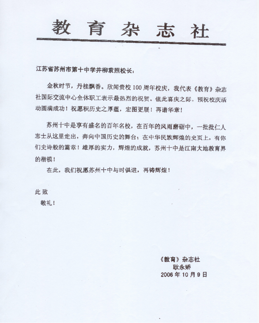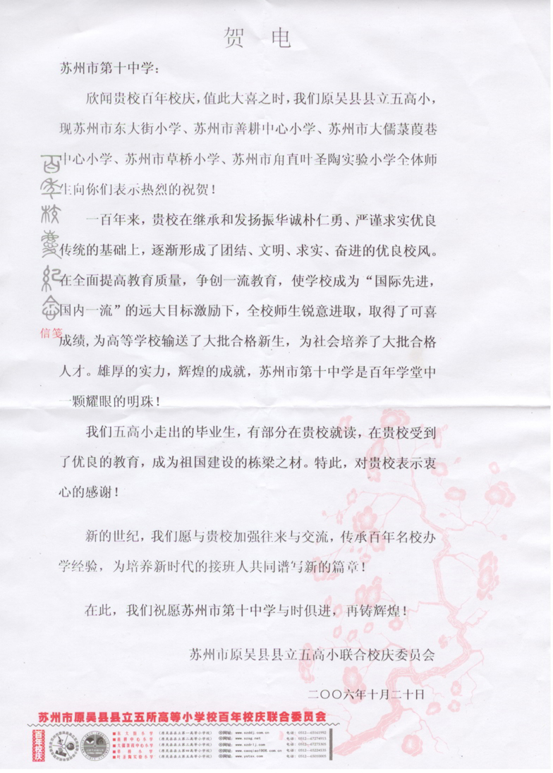 苏州市原吴县县立五高小联合校庆委员会的贺电